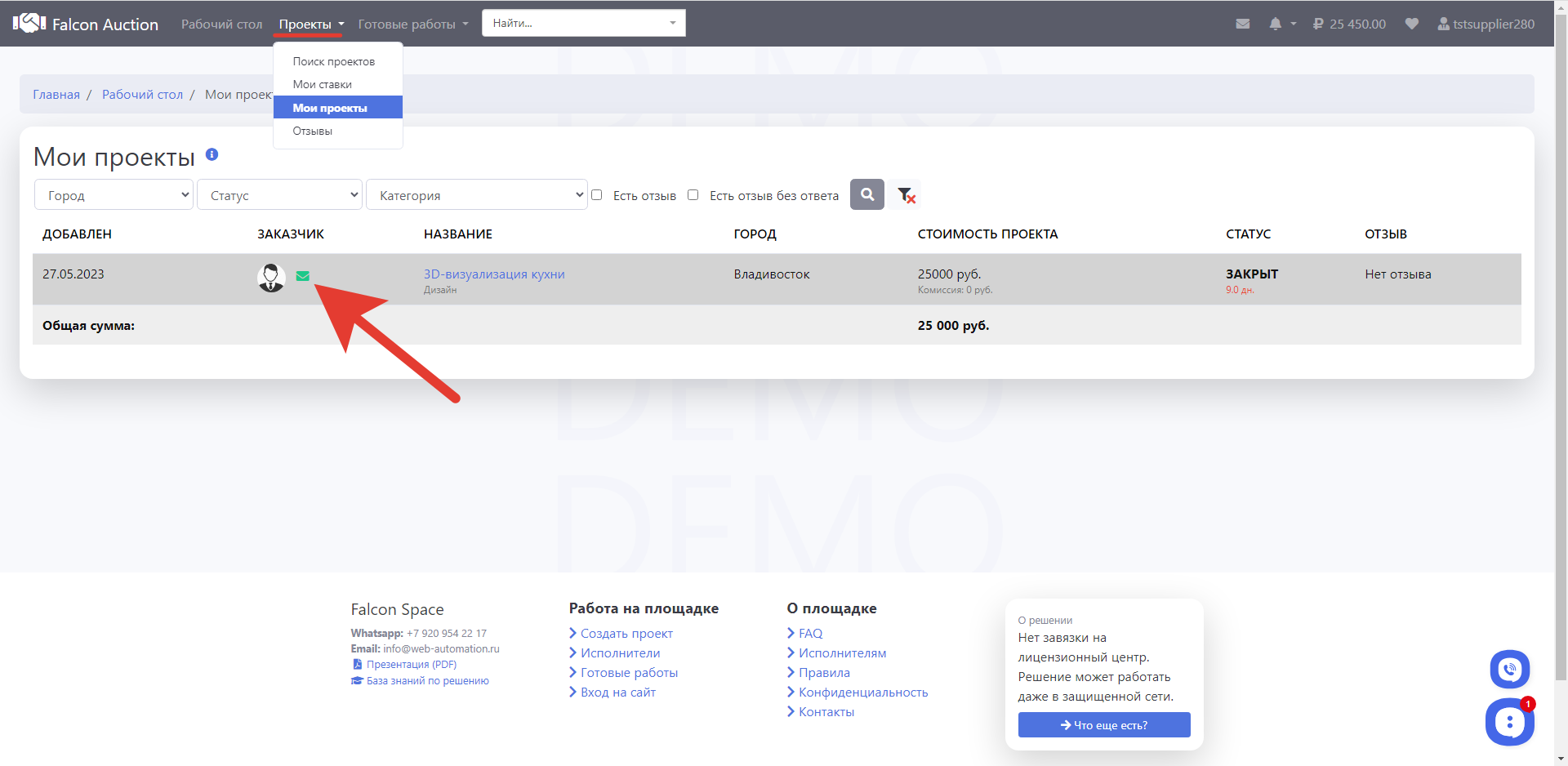 Проекты, на которые вы сделали ставку, отображаются в разделе "Мои проекты" в виде таблицы. Рядом с фото Заказчика проекта находится значок сообщения, нажав на который откроется чат.