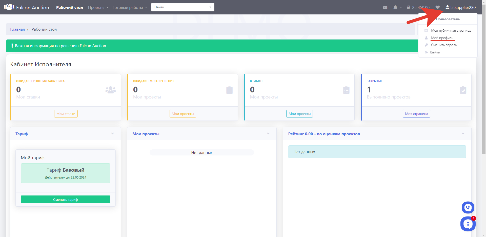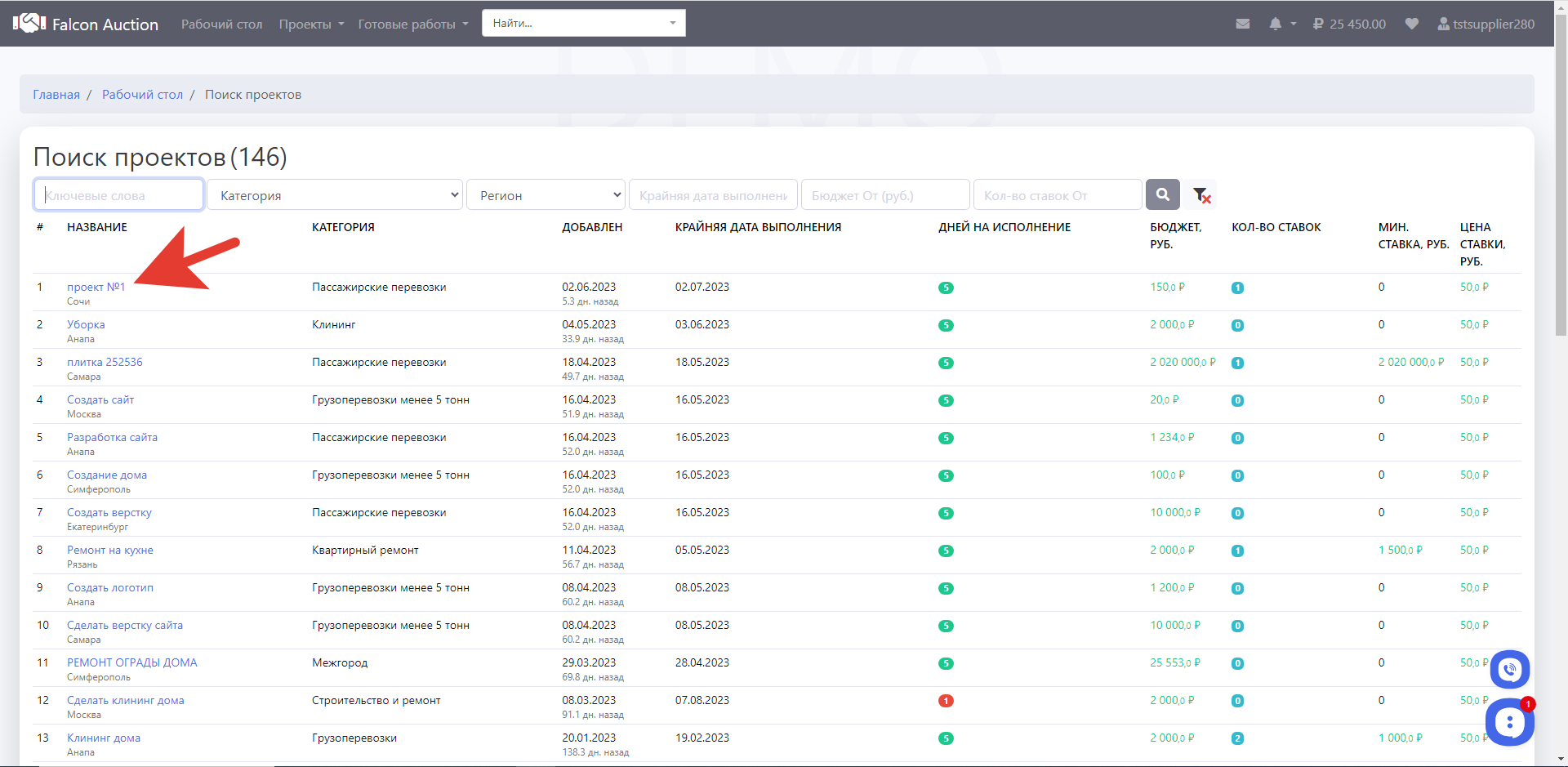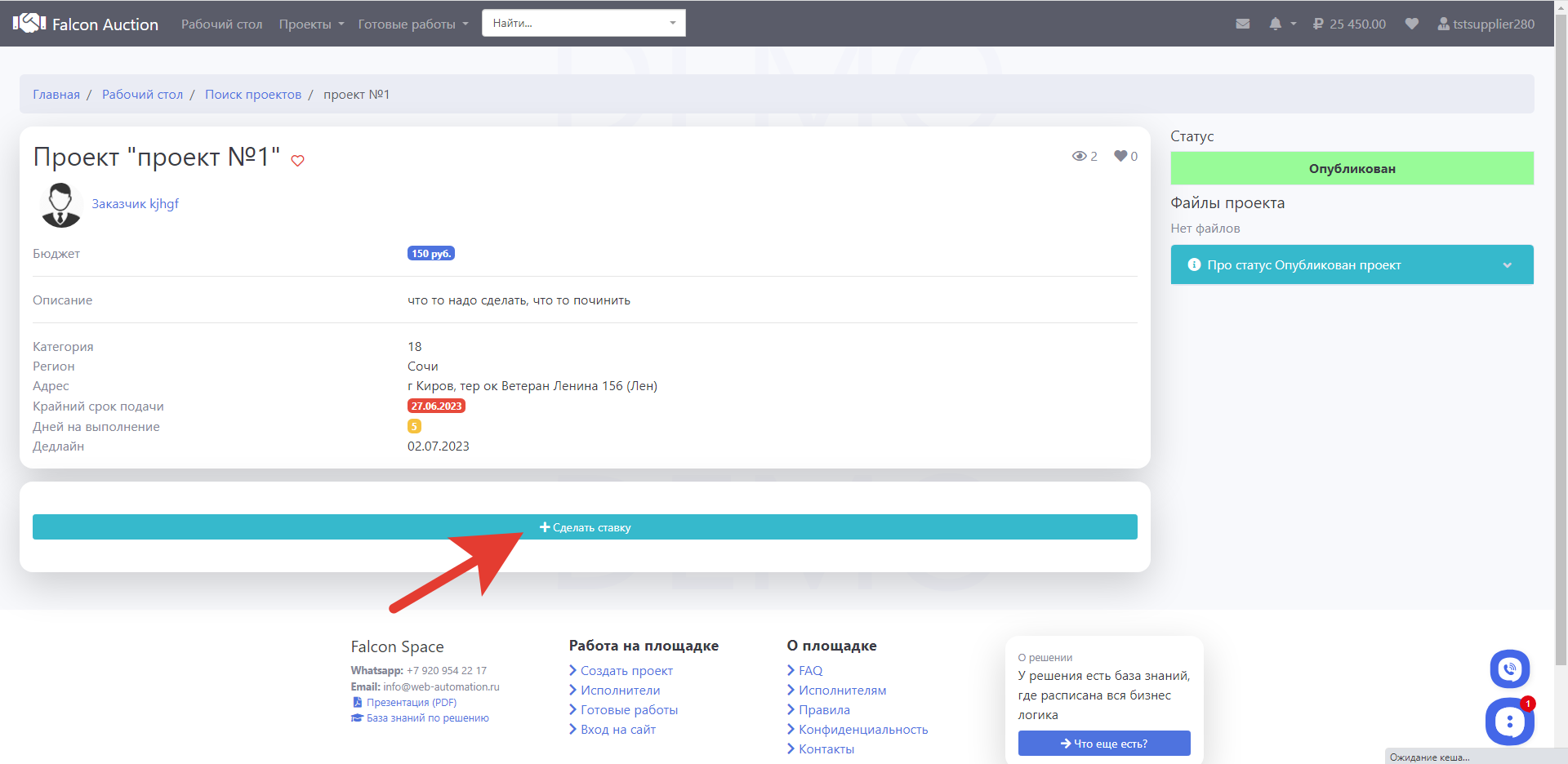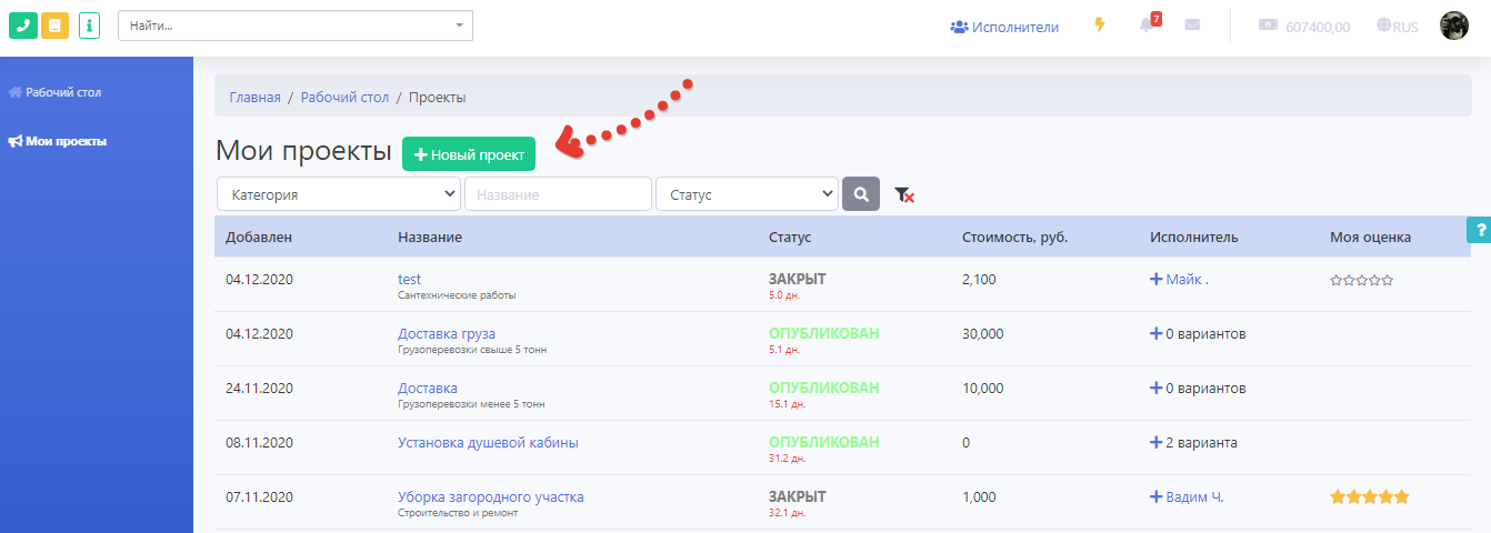 В оазделе "Мои проекты" воспользуйтесь кнопкой "Новый проект" и заполните форму. Обратите внимание, что нужно обязательно выбрать категорию для проекта. После сохранения Проект будет опубликован на Аукционе.