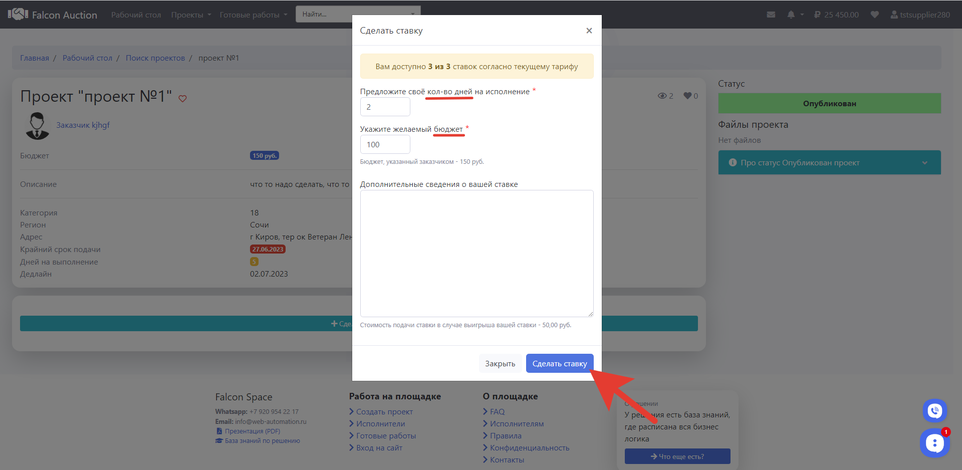 Для отправления ставки Исполнитель должен указать свою стоимость работ и срок исполнения. Также можно оставить комментарий по желанию.