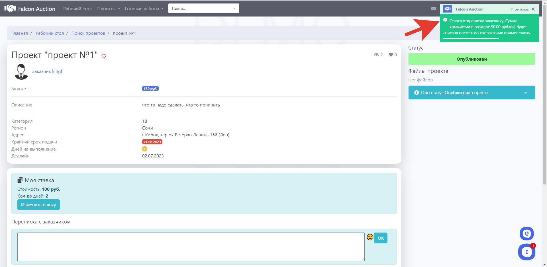 После отправления ставки Исполнитель получает уведомление с подтверждением действия.