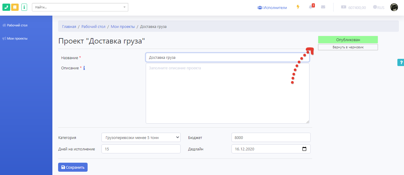 Если вы хотите что-то отредактировать в описании Проекта, необходимо перевести проект в статус "Черновик", отредактировать и опубликовать.