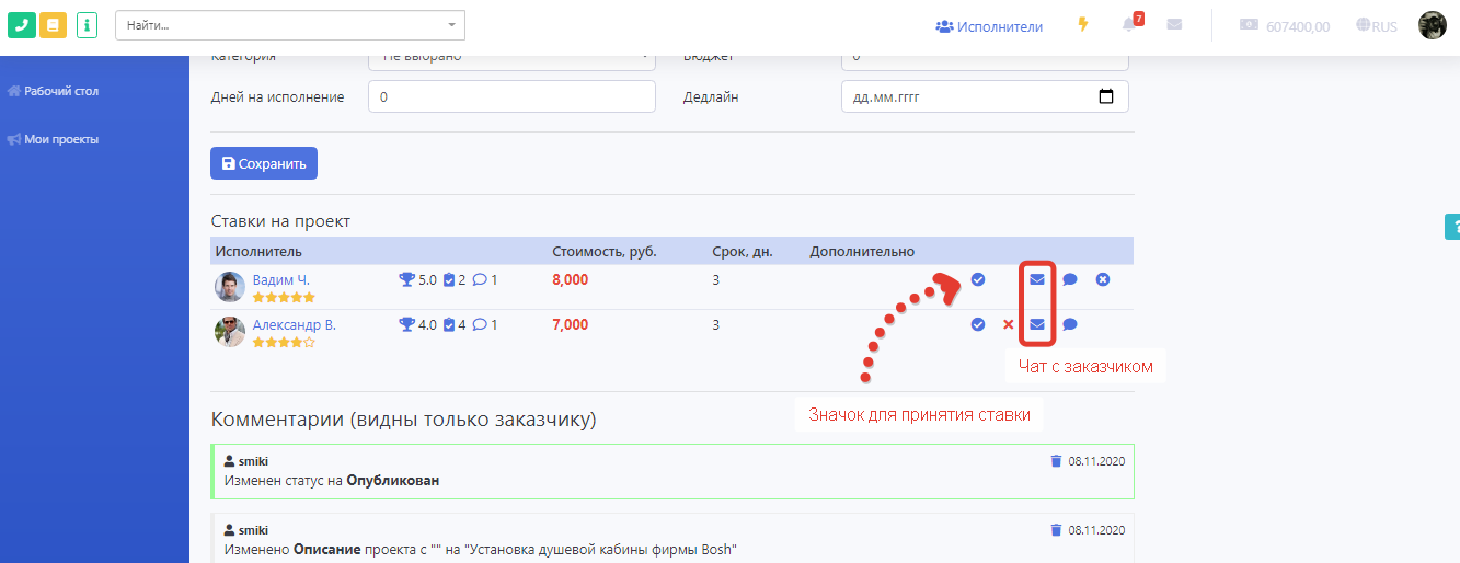 Когда Исполнители сделают ставки на ваш проект, вы получите уведоление. Все ставки вы сможете посмотреть на странице Проекты, также появляется иконка для чата с Исполнителем. Здесь вы выбираете ставку, которая вас устраивает.